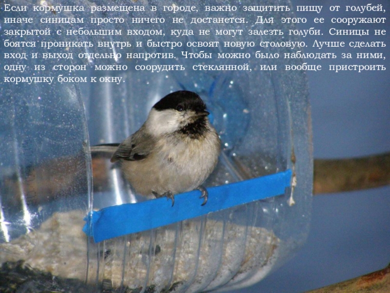 Слайд 12Если кормушка размещена в городе, важно защитить пищу от голубей, иначе