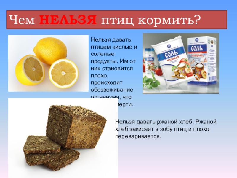 Слайд 26Чем НЕЛЬЗЯ птиц кормить?