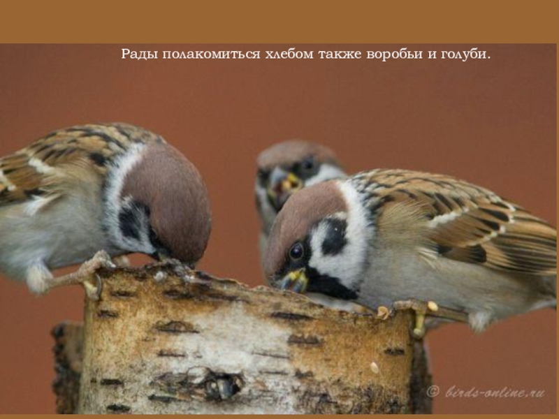 Слайд 8Рады полакомиться хлебом также воробьи и голуби.