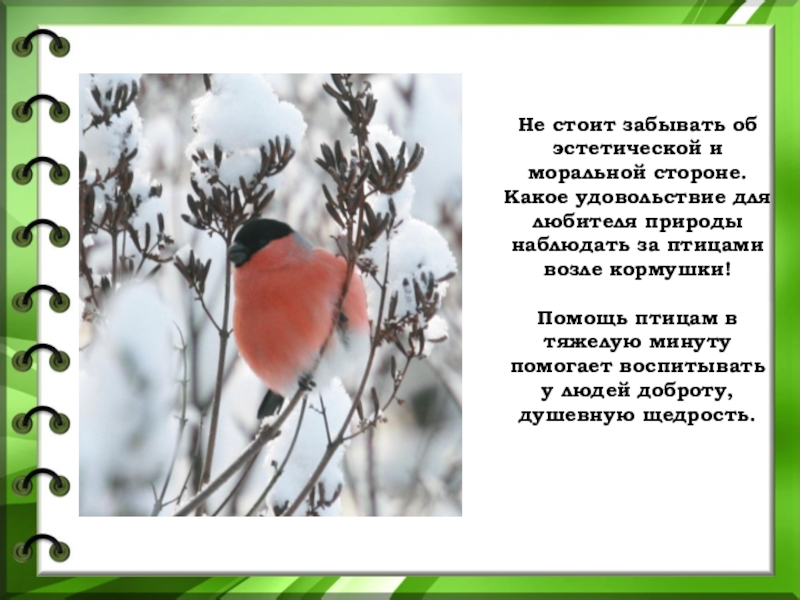 Помощь птицам в тяжелую минуту помогает воспитывать у людей доброту, душевную щедрость.