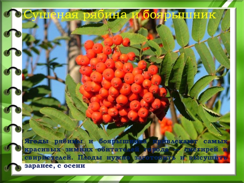 обитателей города — снегирей и свиристелей. Плоды нужно заготовить и высушить заранее, с осени