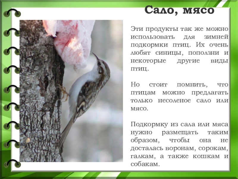 Подкормку из сала или мяса нужно размещать таким образом, чтобы она не досталась воронам, сорокам, галкам, а также кошкам и собакам.