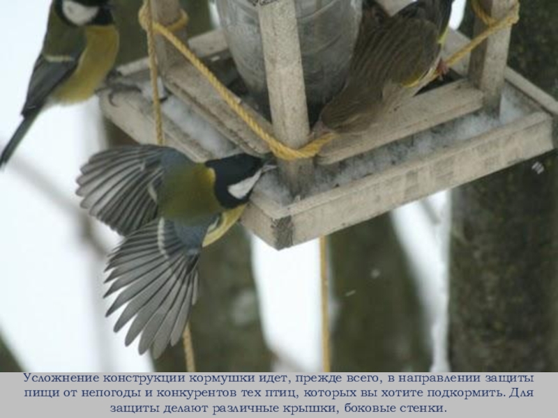 Слайд 11Усложнение конструкции кормушки идет, прежде всего, в направлении защиты пищи от