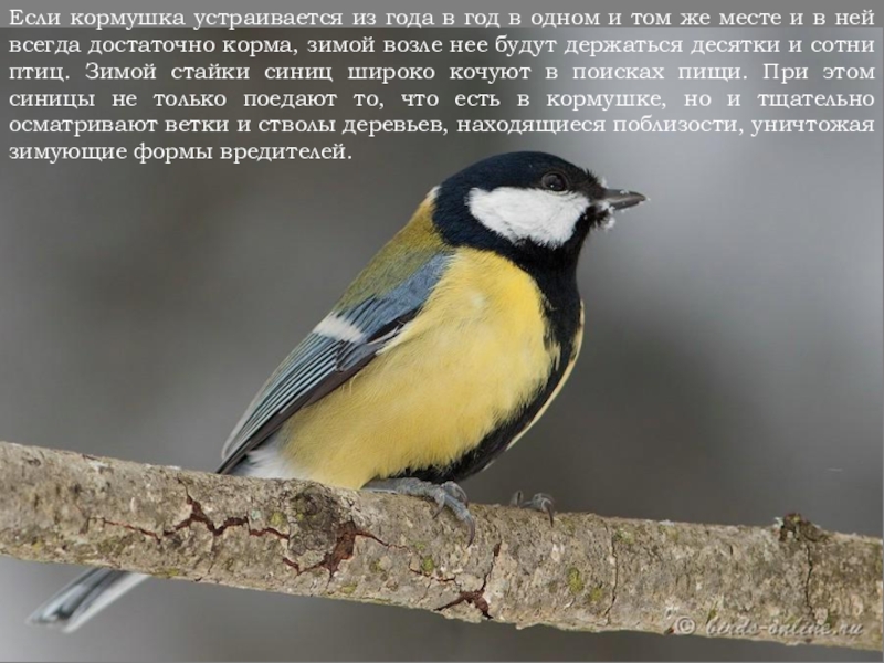 же месте и в ней всегда достаточно корма, зимой возле нее будут держаться десятки и сотни птиц. Зимой стайки синиц широко кочуют в поисках пищи. При этом синицы не только поедают то, что есть в кормушке, но и тщательно осматривают ветки и стволы деревьев, находящиеся поблизости, уничтожая зимующие формы вредителей.