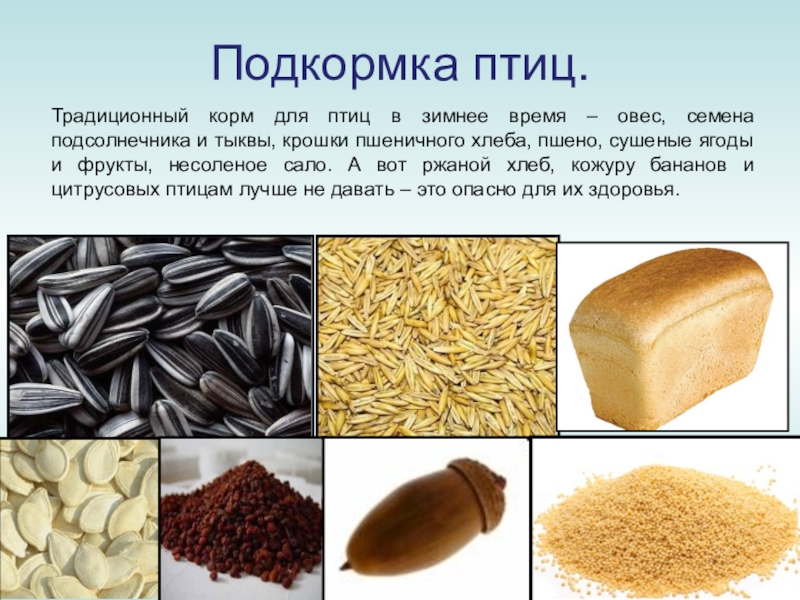 семена подсолнечника и тыквы, крошки пшеничного хлеба, пшено, сушеные ягоды и фрукты, несоленое сало. А вот ржаной хлеб, кожуру бананов и цитрусовых птицам лучше не давать – это опасно для их здоровья.
