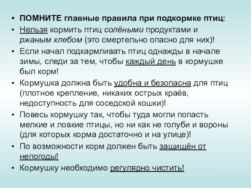 Слайд 16ПОМНИТЕ главные правила при подкормке птиц: