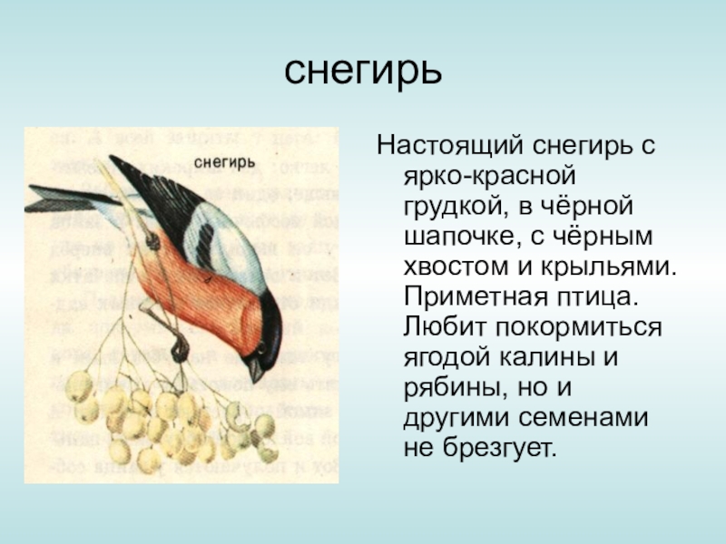 и крыльями. Приметная птица. Любит покормиться ягодой калины и рябины, но и другими семенами не брезгует.