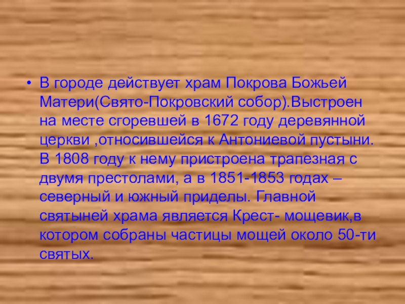 низине. Но как только город стал развиваться ,на горе был выстроен высоченный Троицкий собор.Произошло это в 30- е годы 19 века.При советской власти купола собора были снесены ,а помещение отдано под склад,позже дом культуры .Ныне в этом помещении располагается воскресная школа.