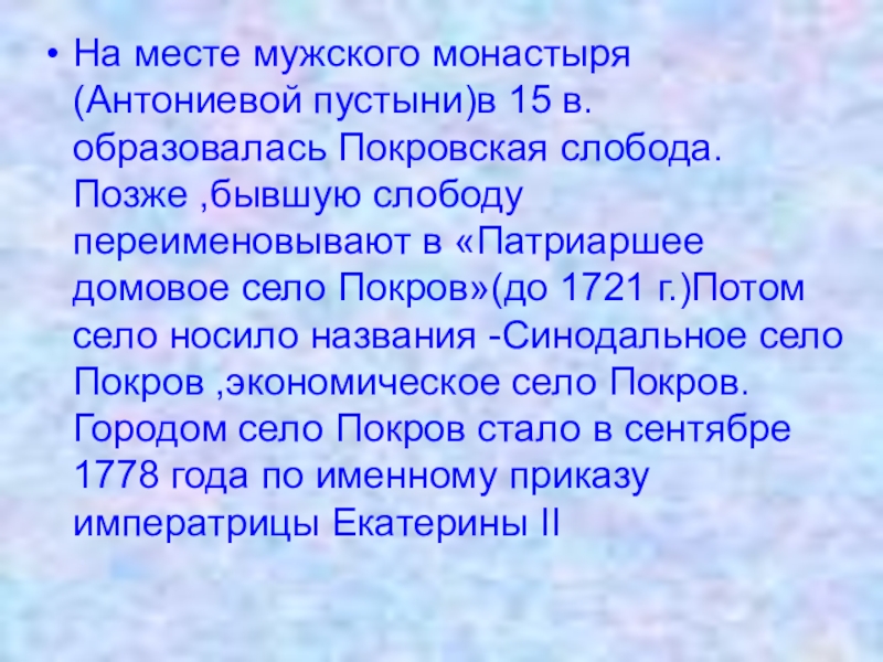 На месте мужского монастыря(Антониевой пустыни)в 15 в. образовалась Покровская слобода. Позже