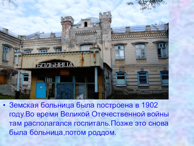 Земская больница была построена в 1902 году.Во время Великой Отечественной войны