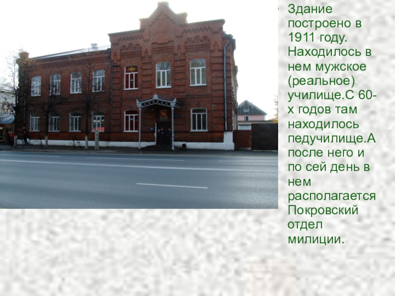 находилось педучилище.А после него и по сей день в нем располагается Покровский отдел милиции.