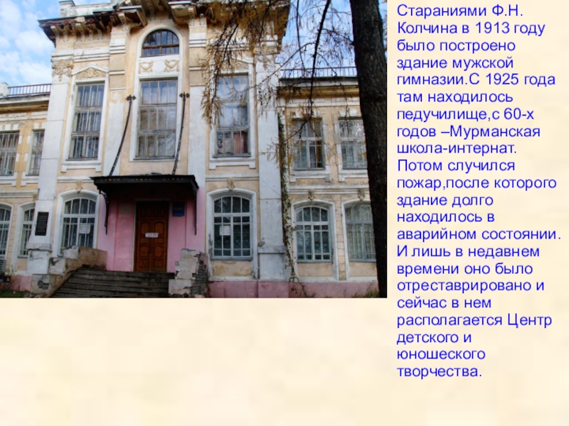 года там находилось педучилище,с 60-х годов –Мурманская школа-интернат.Потом случился пожар,после которого здание долго находилось в аварийном состоянии.И лишь в недавнем времени оно было отреставрировано и сейчас в нем располагается Центр детского и юношеского творчества.
