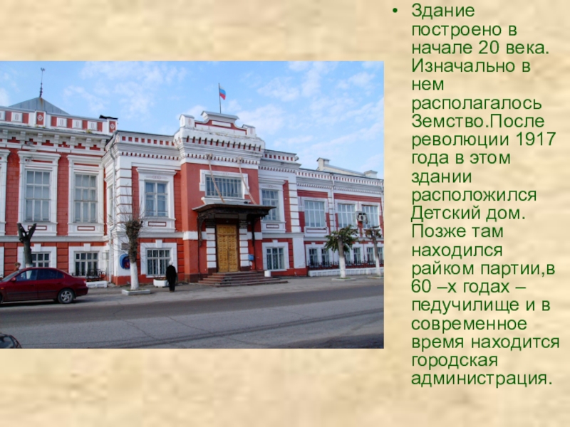 революции 1917 года в этом здании расположился Детский дом.Позже там находился райком партии,в 60 –х годах –педучилище и в современное время находится городская администрация.