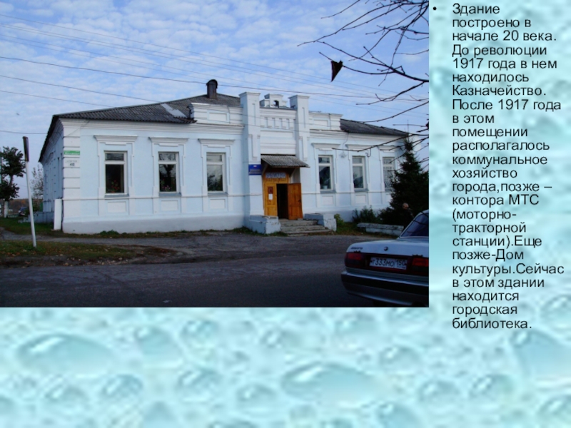 находилось Казначейство.После 1917 года в этом помещении располагалось коммунальное хозяйство города,позже –контора МТС(моторно-тракторной станции).Еще позже-Дом культуры.Сейчас в этом здании находится городская библиотека.