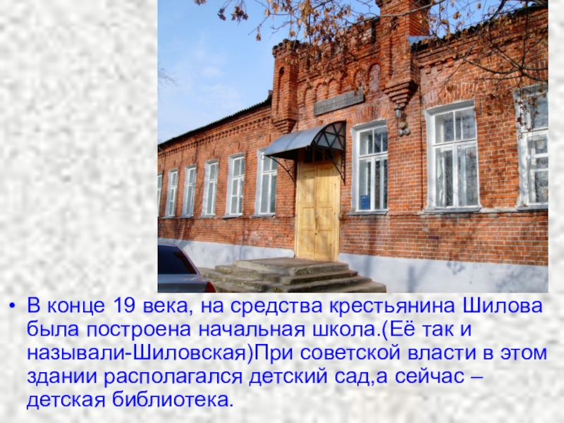 школа.(Её так и называли-Шиловская)При советской власти в этом здании располагался детский сад,а сейчас –детская библиотека.