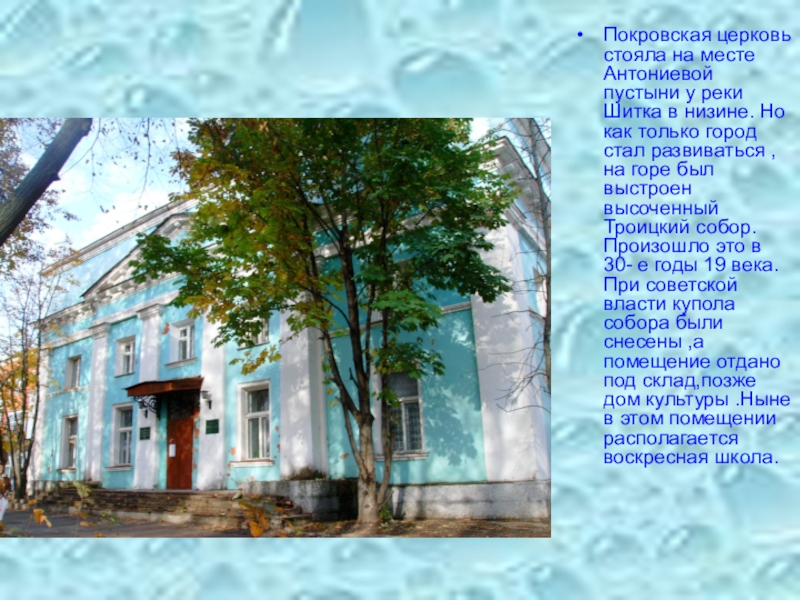 Покровская церковь стояла на месте Антониевой пустыни у реки Шитка в низине. Но как только город стал