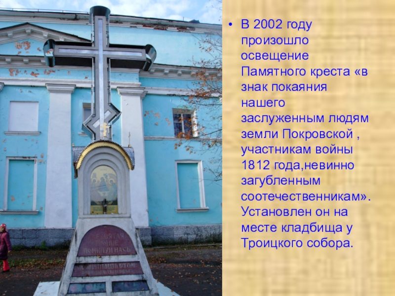 заслуженным людям земли Покровской ,участникам войны 1812 года,невинно загубленным соотечественникам».Установлен он на месте кладбища у Троицкого собора.
