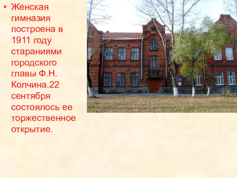 Женская гимназия построена в 1911 году стараниями городского главы Ф.Н.Колчина.22 сентября