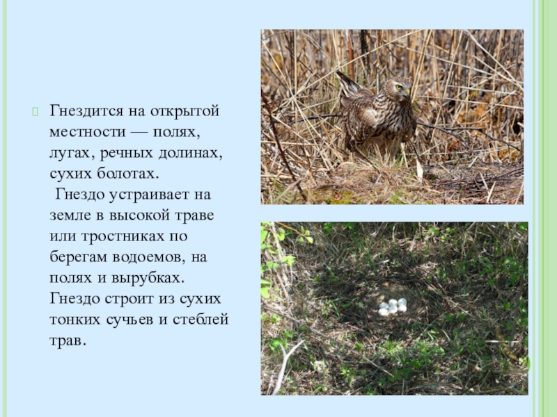 Слайд 5Гнездится на открытой местности — полях, лугах, речных долинах, сухих болотах.