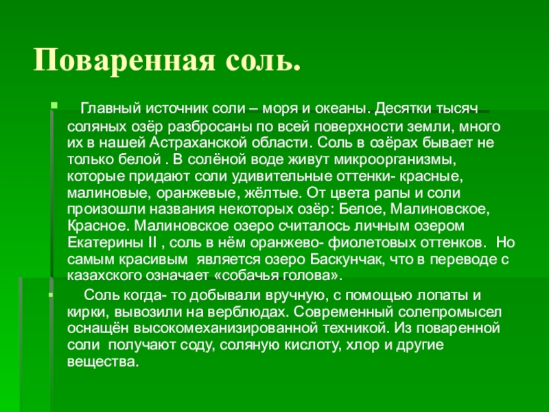соляных озёр разбросаны по всей поверхности земли, много их в нашей Астраханской области. Соль в озёрах бывает не только белой . В солёной воде живут микроорганизмы, которые придают соли удивительные оттенки- красные, малиновые, оранжевые, жёлтые. От цвета рапы и соли произошли названия некоторых озёр: Белое, Малиновское, Красное. Малиновское озеро считалось личным озером Екатерины II , соль в нём оранжево- фиолетовых оттенков. Но самым красивым является озеро Баскунчак, что в переводе с казахского означает «собачья голова».