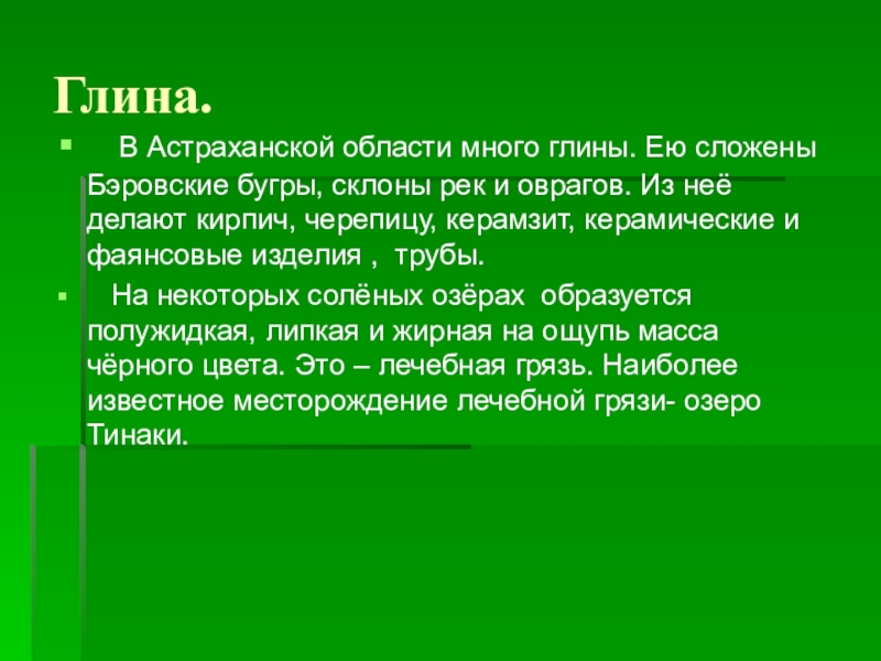 В Астраханской области много глины. Ею сложены Бэровские бугры,
