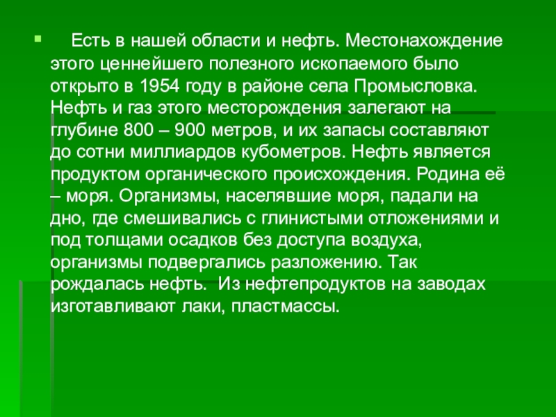полезного ископаемого было открыто в 1954 году в районе села Промысловка. Нефть и газ этого месторождения залегают на глубине 800 – 900 метров, и их запасы составляют до сотни миллиардов кубометров. Нефть является продуктом органического происхождения. Родина её – моря. Организмы, населявшие моря, падали на дно, где смешивались с глинистыми отложениями и под толщами осадков без доступа воздуха, организмы подвергались разложению. Так рождалась нефть. Из нефтепродуктов на заводах изготавливают лаки, пластмассы.