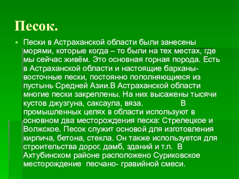 были на тех местах, где мы сейчас живём. Это основная горная порода. Есть в Астраханской области и настоящие барханы- восточные пески, постоянно пополняющиеся из пустынь Средней Азии.В Астраханской области многие пески закреплены. На них высажены тысячи кустов джузгуна, саксаула, вяза. В промышленных целях в области используют в основном два месторождения песка: Стрелецкое и Волжское. Песок служит основой для изготовления кирпича, бетона, стекла. Он также используется для строительства дорог, дамб, зданий и т.п. В Ахтубинском районе расположено Суриковское месторождение песчано- гравийной смеси.