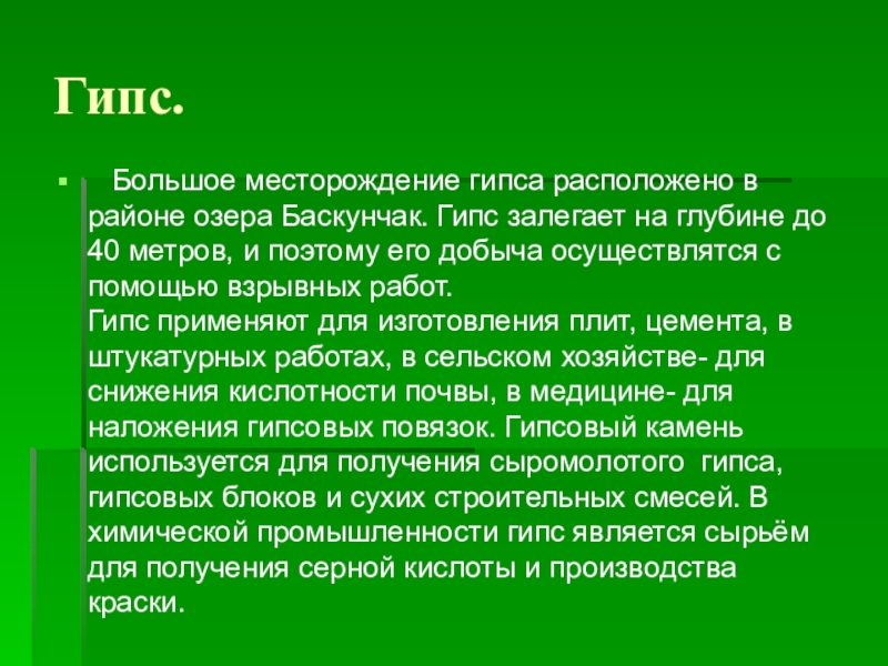 залегает на глубине до 40 метров, и поэтому его добыча осуществлятся с помощью взрывных работ. Гипс применяют для изготовления плит, цемента, в штукатурных работах, в сельском хозяйстве- для снижения кислотности почвы, в медицине- для наложения гипсовых повязок. Гипсовый камень используется для получения сыромолотого гипса, гипсовых блоков и сухих строительных смесей. В химической промышленности гипс является сырьём для получения серной кислоты и производства краски.