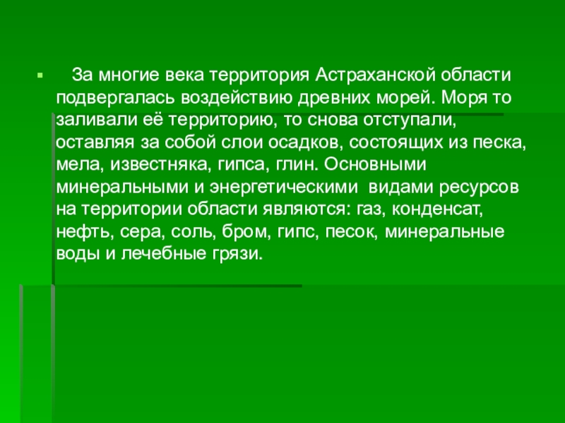 морей. Моря то заливали её территорию, то снова отступали, оставляя за собой слои осадков, состоящих из песка, мела, известняка, гипса, глин. Основными минеральными и энергетическими видами ресурсов на территории области являются: газ, конденсат, нефть, сера, соль, бром, гипс, песок, минеральные воды и лечебные грязи.