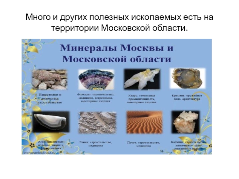 Слайд 7Много и других полезных ископаемых есть на территории Московской области.