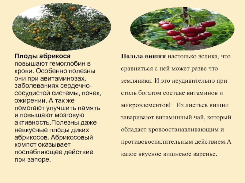 Польза вишни настолько велика, что сравниться с ней может разве что земляника. И это неудивительно при столь богатом составе витаминов и микроэлементов! Из листьев вишни заваривают витаминный чай, который обладает кровоостанавливающим и противовоспалительным действием.А какое вкусное вишневое варенье.