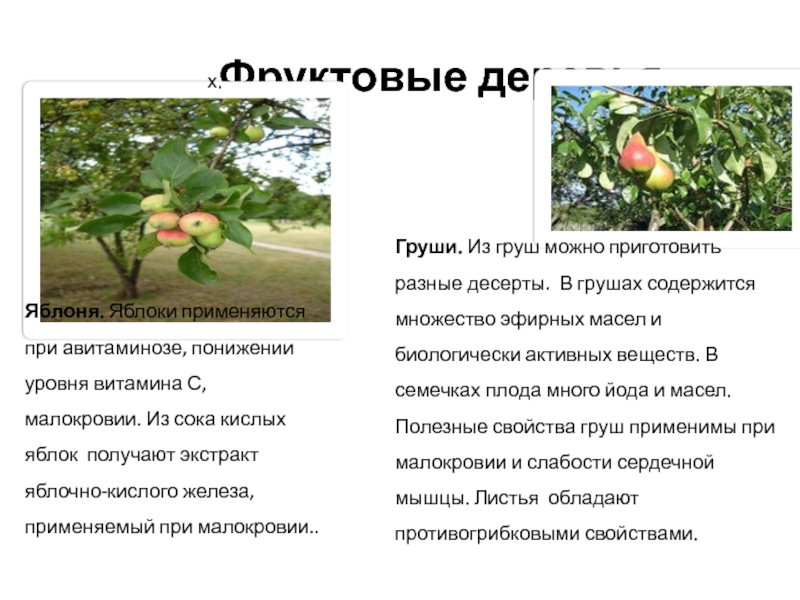 Груши. Из груш можно приготовить разные десерты. В грушах содержится множество эфирных масел и биологически активных веществ. В семечках плода много йода и масел. Полезные свойства груш применимы при малокровии и слабости сердечной мышцы. Листья обладают противогрибковыми свойствами.