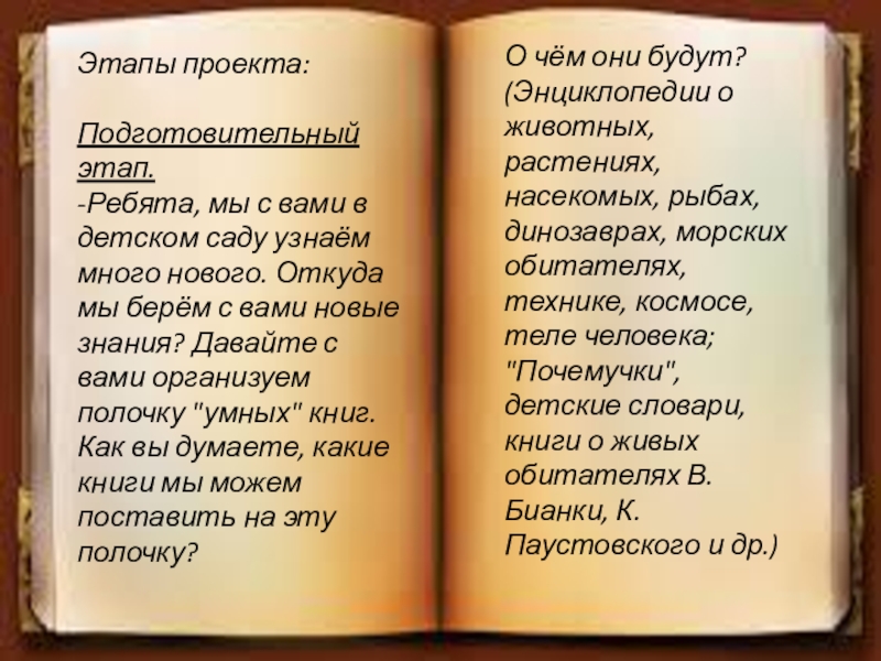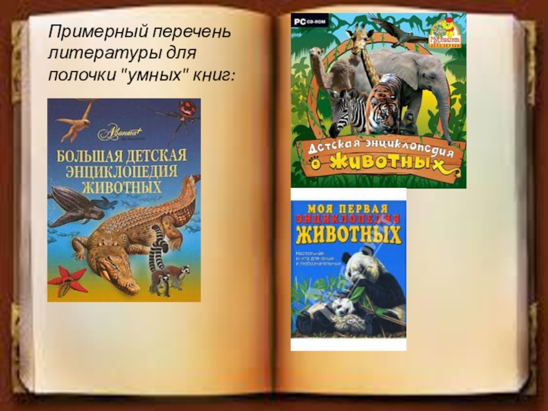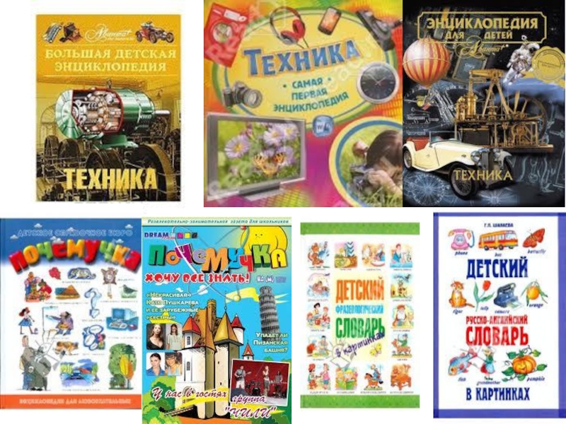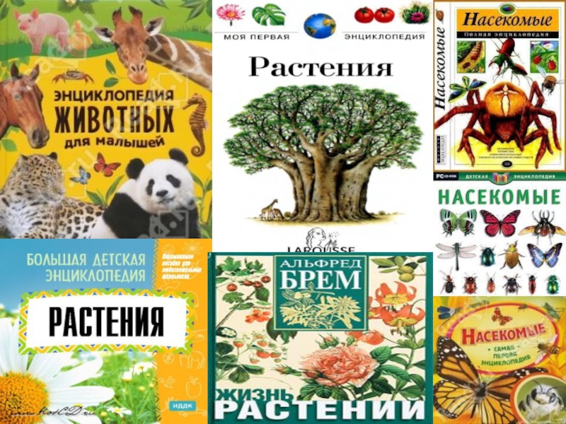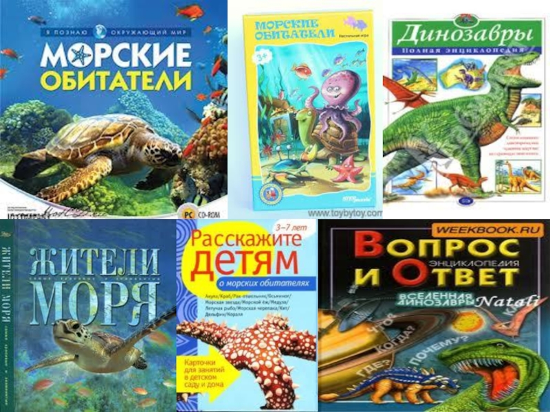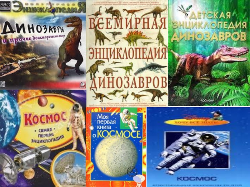 О чём они будут? (Энциклопедии о животных, растениях, насекомых, рыбах, динозаврах, морских обитателях, технике, космосе, теле человека; "Почемучки", детские словари, книги о живых обитателях В.Бианки, К.Паустовского и др.)