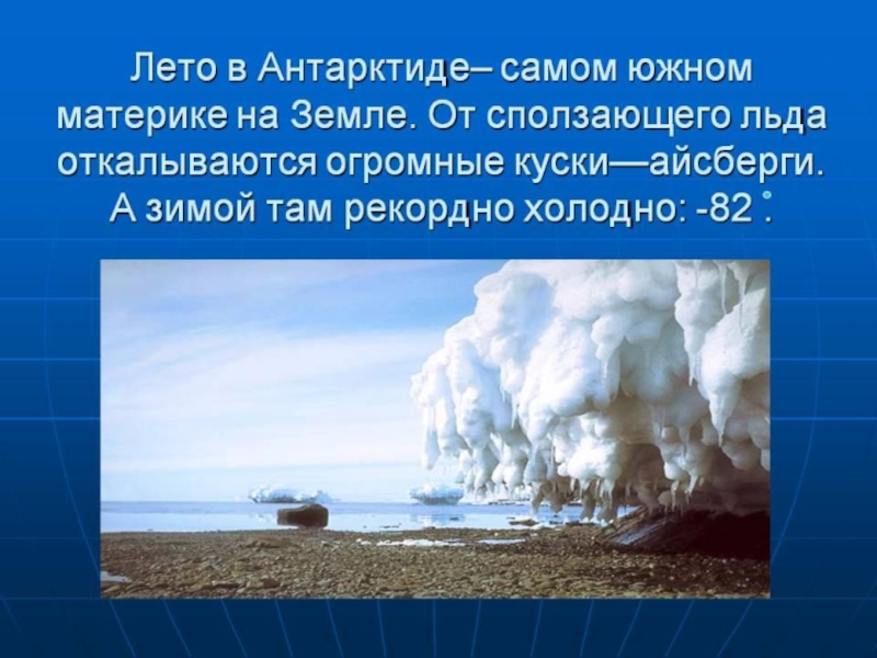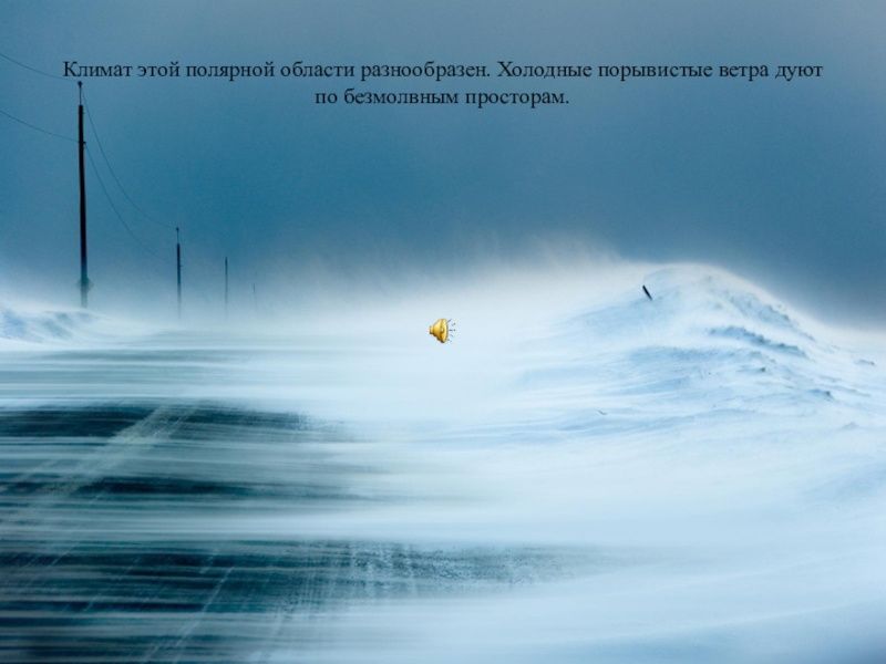 Слайд 14Климат этой полярной области разнообразен. Холодные порывистые ветра дуют по безмолвным