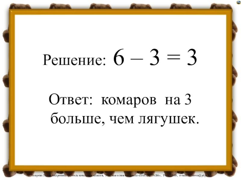 Решение: 6 – 3 = 3Ответ: комаров на 3 больше, чем лягушек.