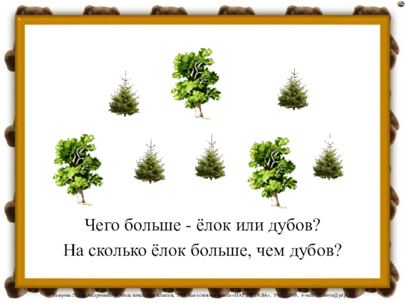 Чего больше - ёлок или дубов?На сколько ёлок больше, чем дубов?
