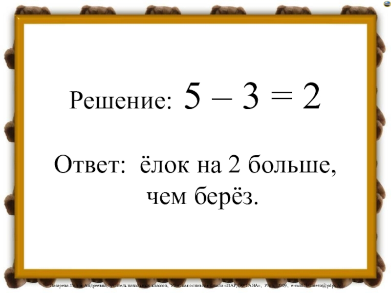 Решение: 5 – 3 = 2Ответ: ёлок на 2 больше, чем берёз.