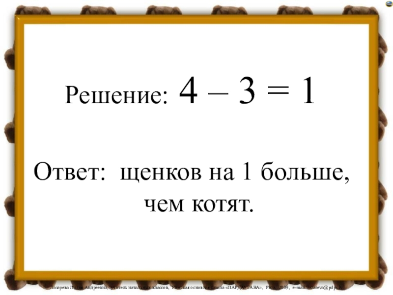 Решение: 4 – 3 = 1Ответ: щенков на 1 больше, чем котят.