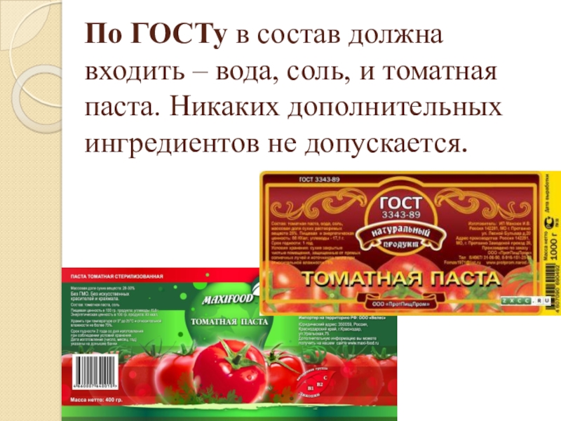 Слайд 24По ГОСТу в состав должна входить – вода, соль, и томатная паста.