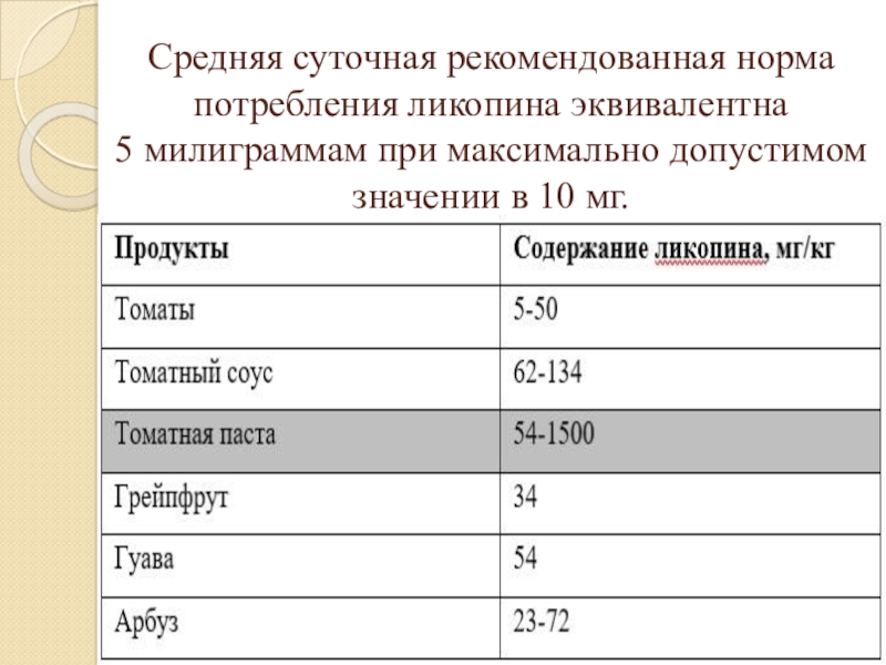 Слайд 13Средняя суточная рекомендованная норма потребления ликопина эквивалентна