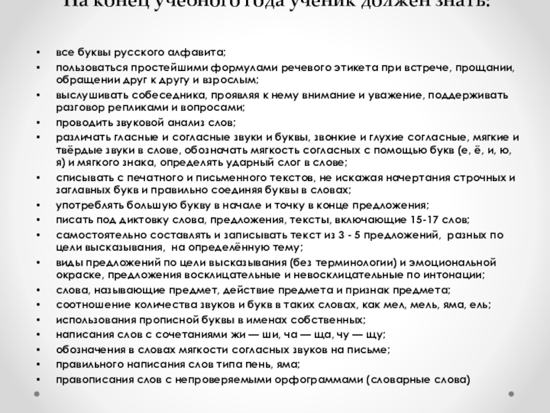 списывать с печатного и письменного текстов, не искажая начертания строчных и заглавных букв и правильно соединяя буквы в словах;