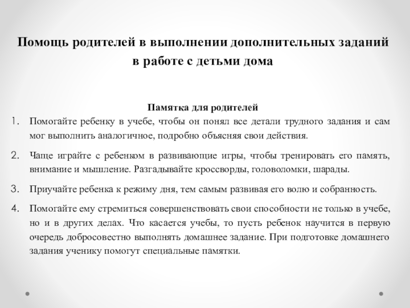 Слайд 2Помощь родителей в выполнении дополнительных заданий в работе с детьми дома