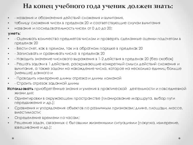 - Находить значение числового выражения в 1-2 действия в пределах 20 (без скобок)