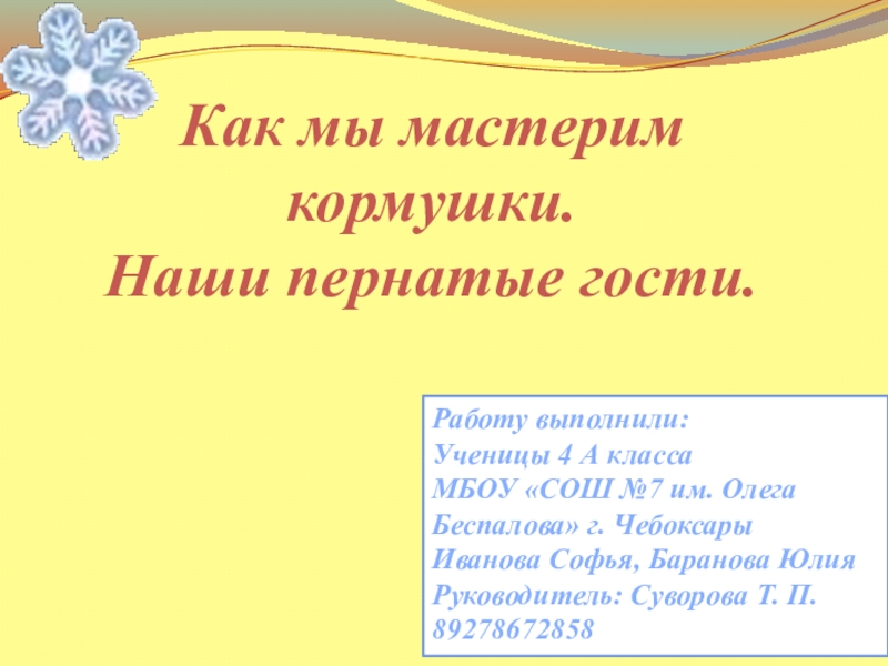 Как мы мастерим кормушки. Наши пернатые гости.Работу выполнили: Ученицы 4 А класса МБОУ «СОШ №7 им. Олега Беспалова» г. Чебоксары Иванова Софья, Баранова Юлия Руководитель: Суворова Т. П. 89278672858
