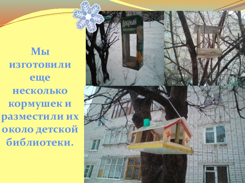 Слайд 10Мы изготовили еще несколько кормушек и разместили их около детской библиотеки.