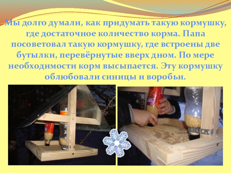 Мы долго думали, как придумать такую кормушку, где достаточное количество корма. Папа посоветовал такую кормушку, где встроены