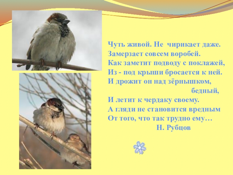 Замерзает совсем воробей.