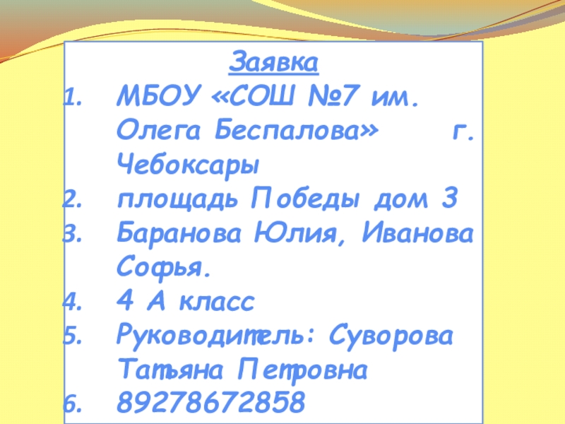ЗаявкаМБОУ «СОШ №7 им. Олега Беспалова»   г. Чебоксарыплощадь Победы дом 3Баранова Юлия, Иванова Софья.4 А