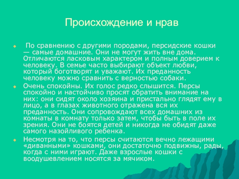 Очень спокойны. Их голос редко слышится. Персы спокойно и настойчиво просят обратить внимание на них: они сидят около хозяина и пристально глядят ему в лицо, а в глазах животного отражена вся их преданность. Они сопровождают всех домашних из комнаты в комнату только затем, чтобы быть в поле их зрения. Они не боятся детей и никогда не обидят даже самого назойливого ребенка.