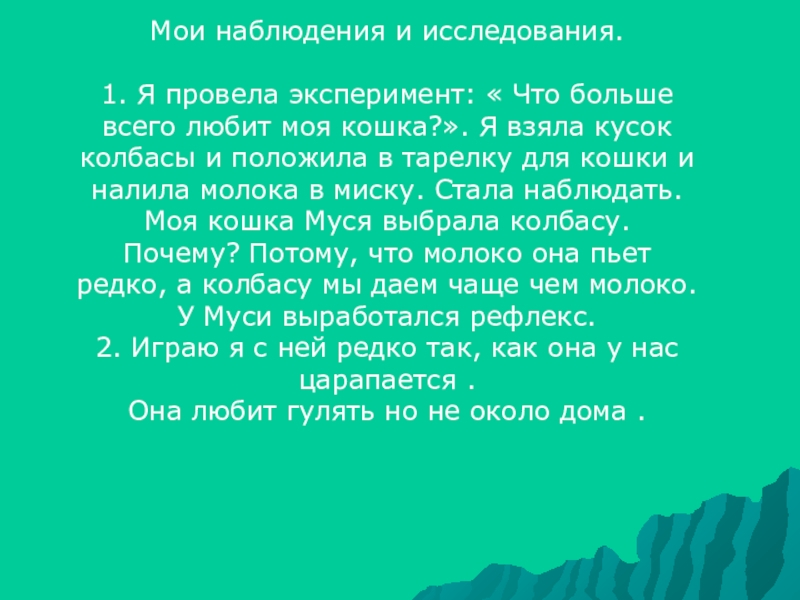 всего любит моя кошка?». Я взяла кусок колбасы и положила в тарелку для кошки и налила молока в миску. Стала наблюдать. Моя кошка Муся выбрала колбасу. Почему? Потому, что молоко она пьет редко, а колбасу мы даем чаще чем молоко. У Муси выработался рефлекс.